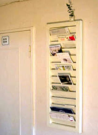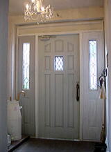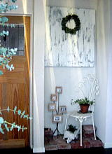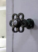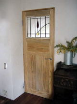 しっくいの壁、少し古びたような仕上がりの飾り棚、アンティークステンドグラスをはめた扉…